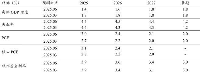 • 经济虽有韧性,但滞胀担忧仍在:经济表现稳健,增速维持在1.5%-2%区间。经济不确定性较4月峰值已有所回落,4、5月经济数据体现出一定韧性。但本次美联储下调经济增长预测,上调通胀预期,并小幅修正失业率预测,体现出在关税政策不确定性下滞胀担忧仍存。
